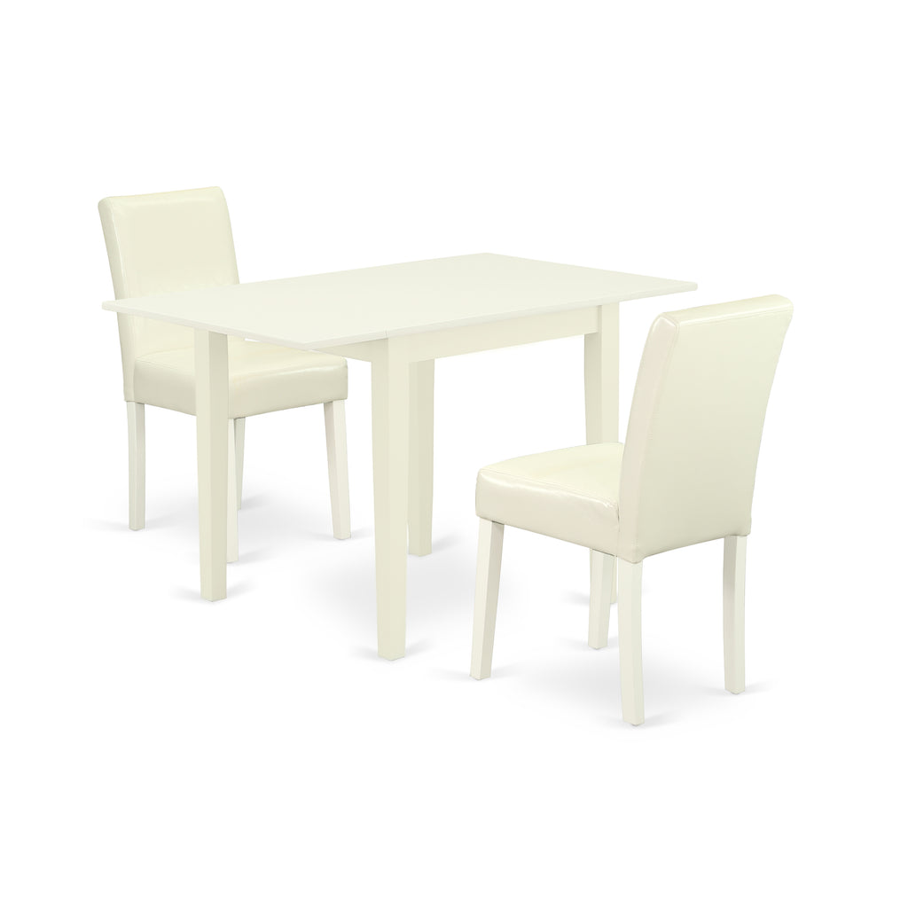 Deliver a luxurious elegance to your kitchen with our 3 piece dining set. You receive two amazing dining chairs and a fabulous kitchen table in this amazing 3 piece modern dining table set Cutting-edge design of these parson dining chairs and modern dining table will enhance the magnificence of any dining area. Luxurious White PU Leather back and the seat of these chairs for the dining room will give amazing support to your back and amazing sitting experience. The frame of these unique dining chairs and two 9-inch drop leaves dining room table is constructed from High-Quality Asian Solid wood (Rubber Wood) which gives fantastic robustness and stability to these dining chairs and wood dining table. Soft and comfy foam padded seat and back of these amazing parson chairs are wrapped in Good Quality White Pu Leather which features a magnificent style and relaxing sitting experience. Exclusive durable wooden structure, nice Pu Leather seat, and back, dependable dinner table deliver Contemporary appearance to your dining area, excellent steadiness to these amazing parson chairs and dining room table, and nice support to your back. Because of the incredibly perfect dimensions, this modern dining table set is quite simple to carry, clean, assemble and modify its places, Incredible designs of this special wooden table fits nicely with any room decoration and a soft cushion upholstered seat and back in smooth Pu Leather of these dining room chairs will keep users relaxed.