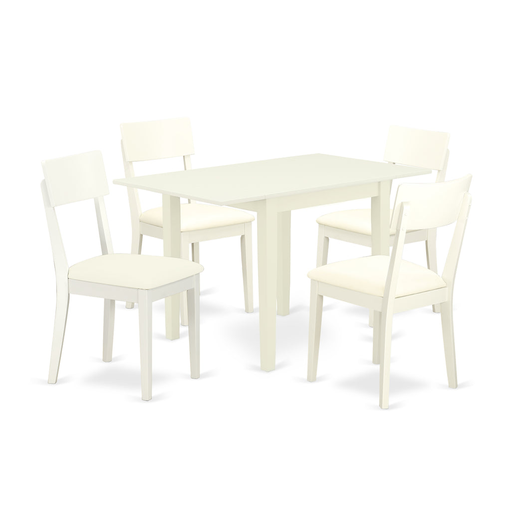 Offer an elegant elegance to your dining area with our 5 pieces Dinette set. You will get 4 great dining chairs, an attractive dining room table in this awesome 5-piece dining table set Exclusive design of these wooden dining chairs and dining room table will enrich the magnificence of any kitchen. Relaxing Linen White Faux Leather, seat and Linen White finish solid wood ladder back of these kitchen chairs will deliver excellent support to your back and fantastic sitting experience. The structure of these impressive dining table chairs and two 9-inch drop leaves dining room table is built from Superior Quality Asian Hardwood (Rubber Wood) which delivers outstanding robustness and stability to these dining chairs and breakfast table. Soft and comfortable foam padded seat and hardwood ladder back of these fabulous dining room chairs provides a magnificent look and comfy sitting experience. Cutting edge long-lasting solid wood structure, comfortable Faux Leather seat, reliable wooden table provide an Exclusive look to your dining area, excellent steadiness to these awesome kitchen chairs and wood dining table, and comfortable support to your back. Because of the surprisingly perfect dimensions, this wooden dining table set is very easy to carry, wash, assemble and change its places, Timeless styles of this creative wood table fits well with any home decoration and a soft cushion padded seat in smooth Faux Leather and ladder back of these dining room chairs will keep users comfortable.