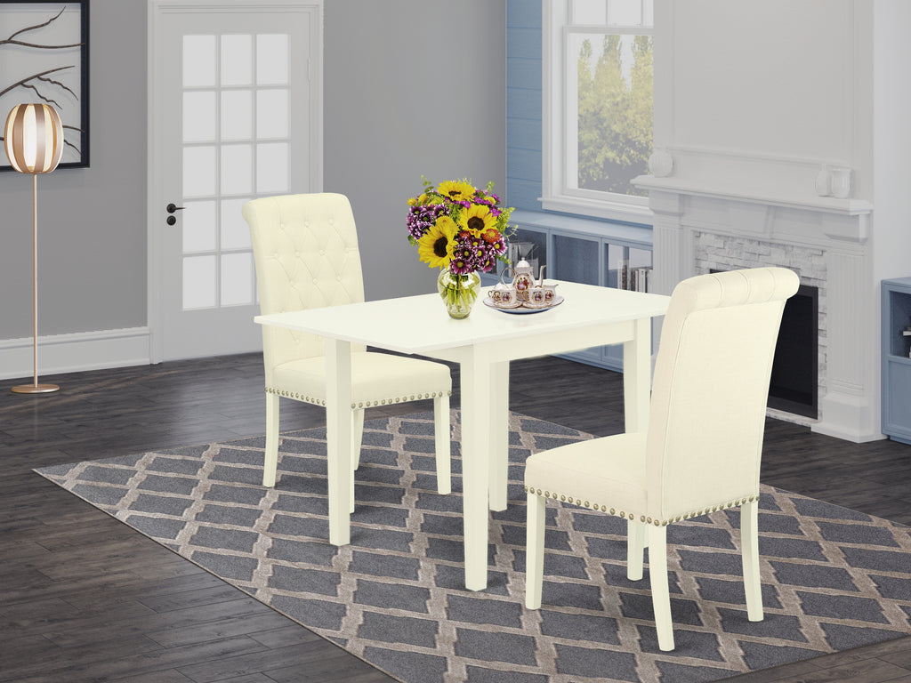 Offer a luxurious elegance to your dining room with our 3-piece Dinette set. You get two great parson dining chairs and an attractive breakfast table in this astounding 3 pieces wooden dining table set Cutting edge style of these parson chairs and the wood table will enhance the attractiveness of any kitchen. Relaxing Light Beige Linen Fabric full back and seat of these chairs for dining room will give fantastic support to your back and a wonderful sitting experience. The frame of these impressive dining chairs and two 9-inch drop leaves wood table are created from High-Quality Asian Hardwood (Rubber Wood) which gives wonderful robustness and stability to these parson chairs and wood table. Soft and comfy foam padded seat and button tufted back of these amazing kitchen chairs are wrapped in Superior Quality Light Beige Linen Fabric which provides an outstanding style and comfortable sitting experience. Exclusive durable solid wood structure, luxurious Linen Fabric seat, and back, dependable kitchen table gives a Contemporary appearance to your dining room, wonderful stableness to these amazing parson chairs and dining table, and comfortable support to your back. Due to the surprisingly perfect dimensions, this wooden dining table set is easy to carry, clean, assemble and modify its places, Amazing designs of this unique wooden table fits perfectly with any interior decoration and a delicate cushion upholstered seat and button tufted back in smooth Linen Fabric of these parson dining chairs will keep users comfortable.