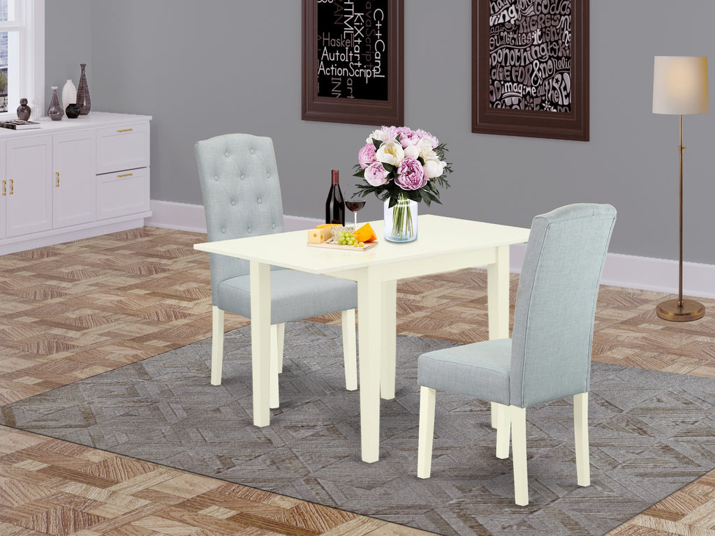 Deliver an elegant beauty to your dining room with our 3 piece dining set. You get two fabulous dining chairs, a gorgeous breakfast table in this wonderful 3 piece dining set Exclusive design of these chairs for the dining room, and modern dining table will boost the beauty of any dining room. Comfy Baby Blue Linen Fabric high back and seat of these parson chairs will give fantastic support to your back and a marvelous relaxing experience. The body of these creative kitchen chairs and two 9-inch drop leaves wooden table is created from Premium Quality Asian Solid wood (Rubber Wood) which delivers great sturdiness and stability to these chairs for the dining room and dining room table. Gentle and relaxing foam padded seat and button tufted high back of these great dining room chairs are wrapped in High-Quality Baby Blue Linen Fabric which features a magnificent style and relaxing sitting experience. Cutting edge durable hardwood structure, luxurious Linen Fabric seat and button-tufted back, dependable kitchen table delivers modern look to your dining area, outstanding steadiness to these impressive parson dining chairs and wood dining table, and luxurious support to your back. Thanks to the incredibly ideal dimensions, this dining room table set is very simple to carry, clean, assemble and modify its places, Amazing designs of this distinctive dinner table suits nicely with any decor and a gentle cushion upholstered seat and button tufted high back in smooth Linen Fabric of these kitchen chairs will keep users comfortable.