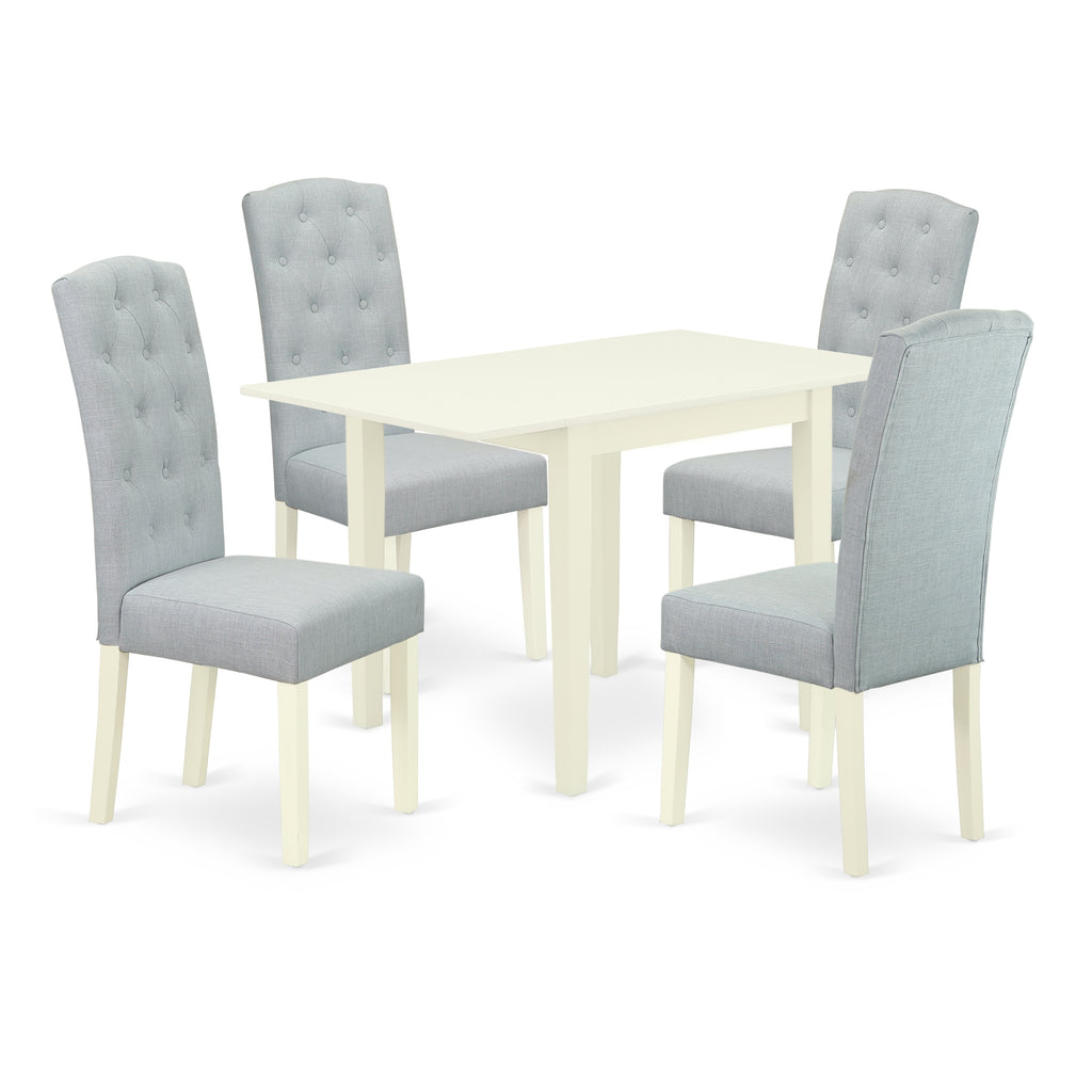 Offer an elegant beauty to your dining area with our 5 pieces wooden dining table set. You will get four fabulous dining chairs and a lovely breakfast table in this impressive 5 piece Dinette set Exclusive style of these parson chairs and kitchen table will improve the beauty of any dining room. Comfy Baby Blue Linen Fabric high back and seat of these chairs for dining room will give great support to your back and a fantastic relaxing experience. The body of these Exclusive kitchen chairs and two 9-inch drop leaves wooden table is constructed from Superior Quality Asian Hardwood (Rubber Wood) which gives excellent robustness and stability to these parson dining chairs and dining room table. Soft and nice foam padded seat and button tufted high back of these magnificent dining chairs are wrapped in Top Quality Baby Blue Linen Fabric, which features a spectacular glance and comfortable sitting experience. Exclusive durable wooden structure, relaxing Linen Fabric seat and button-tufted back, dependable wood dining table offer modern appearance to your dining area, fantastic stability to these amazing parson dining chairs and dining room table, and nice support to your back. Thanks to the incredibly perfect size, this Dinette set is very easy to carry, clean, assemble and modify its places, Incredible designs of this special dining table fits well with any home decoration and a soft cushion upholstered seat and button tufted high back in smooth Linen Fabric of these dining chairs will keep users relaxed.