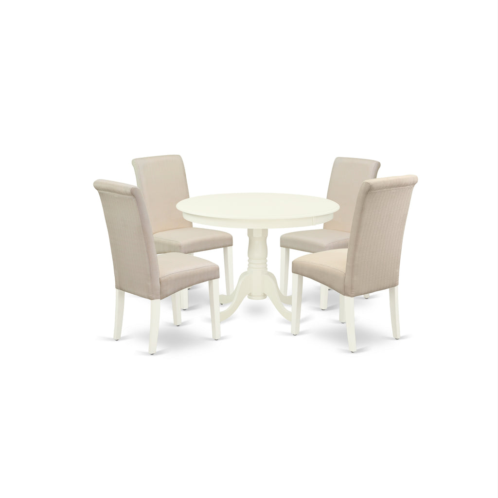 A well designed dining room brings an affectionate family feeling and assures that meals are always filled with joy. This amazing HLBA5-LWH-01 dinette set includes a round dining table and four parson chairs finished in distinctive lovely color linen white to compliment any kind of dining area or home's kitchen. The fresh and clean lines dominate the cutting-edge design of the round kitchen Dinette table of this exclusive kitchen Set. Made up of rubber wood, the dining table offers maximum support and stability with its pedestal styled base. This Kitchen table requires a very little space and it'd be a great choice if you are struggling with space in your dining area. The Barry upholstered parson chair is a tasteful, well-made seating solution. This dining chair features a beautiful stitched exterior. Tall back, upholstery, rolled back, high-density foam padding, solid hardwood frame construction, and linen upholstery make these kitchen chairs comfortable, durable and attractive. Whether you use this dinette chair in your dining room, kitchen, office or basement, it is an easy to assemble and stylish answer to your seating needs. The standard shape, size and design makes the dining area significantly attractive. This contemporary, budget friendly, durable and comfortable dinette set can be good choice if you are looking for a great dining time experience with your family or friends.